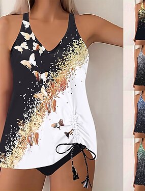 Naisten tankini 2-osainen uimapuku röyhelöinen vatsansalpaus korkeavyötärö ohuet selästä avonaiset lomaranta-asut ombre-perhonen V-kaula-aukoilla ilman hihoja
