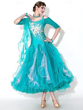 naisten tanssiaispuku kukkakuvioinen kirjailtu kerrostettu verkkokuvio strassikuvio olkapäät paljastava elegantti valssi-tango foxtrot -kilpailuesitys – riikinkukonsininen