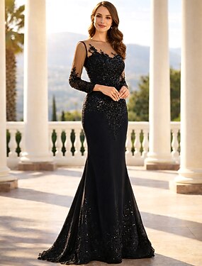 Mermaid Trumpetti Pitkä Musta Mekko Valmistusmekko Kotiinpaluu Mekko Pääsymekot Elegantti Vintage Kimalle Pitkä Hihainen Olkasauma Pääsymekko Valentinpäivä Kristallien kanssa