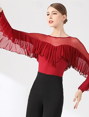 naisten tanssitoppi läpikuultava verkkokangas röyhelöinen lepakkohihainen paita latinalainen valssi harjoitusasu moderni esiintymispaita punainen