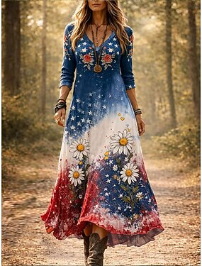 itsenäisyyspäivä isänmaallinen naisten midi-mekko paita-mekko rento tapa säännöllinen istuvuus kukkagraafinen lippu pitkähiha V-kaula-aukko sininen kevät syksy talvi
