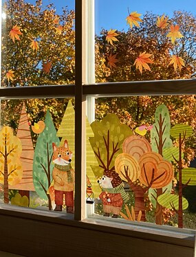 Syksyn ikkunatarrat syksyiseen kiitospäivän koristeluun, kaksipuoliset näkyvät staattiset tarrat sarjakuvametsän lehdillä, ketulla ja siilillä, irrotettavat lasiset tarrat ikkunaan ja esillepanoon