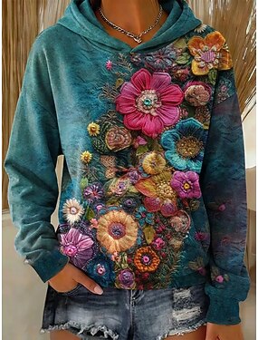 Naisten Pullover-huppari Tilkkutäkki Painettu Edessä tasku Kukka Kuvitettu Vintage Vapaa-aika Pitkähihainen Hupullinen Tavalliset topit Kausaliteetti Katu Arkikäyttö Purppura Ruskea Apila Kevät Talvi