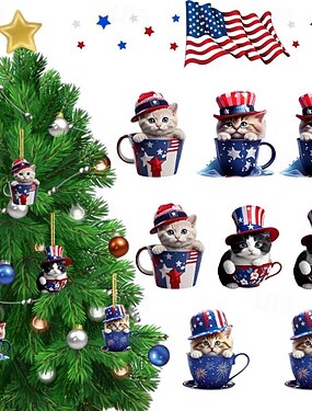 8 kpl isänmaallisia koristeita 4. heinäkuuta, söpö kissanpentu teekupissa roikkuva koriste, itsenäisyyspäivän punainen valkoinen sininen Amerikan lippu kissapuukoriste kotijuhliin, muistopäivän lahjat