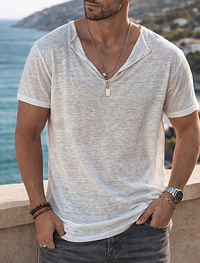 Miesten T-paita Pellava T-paita Lyhythihainen Lyhyt hiha Henley kaulus Kesä Tavallinen Muoti Suunnittelija Perus Soft Kausaliteetti Loma Katu Vaalean sininen Musta Valkoinen Top T-paita miehille