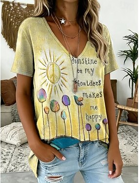 Naisten T-paita Painettu Kukka Kuvitettu Kasvit Böömi Vintage Tyylikäs Lyhythihainen V kaula-aukko Tavalliset topit Päivittäin Sininen Keltainen Punastuvan vaaleanpunainen Purppura Apila Kesä Kevät
