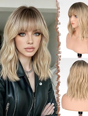 Olkapäälle ulottuvat peruukit otsatukalla - ombre-vaalea luonnollisen näköinen laineikas keskipitkä synteettinen polkkatukkaperuukki naisille päivittäiseen juhlakäyttöön, 14 tuumaa