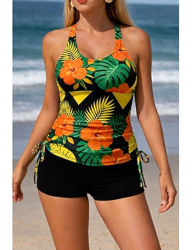 Naisten tankini 2-osainen uimapuku leopardikuvioinen cheeki vatsan tuki korkea vyötärö slim selkä avoin lomaranta-asu kukkakuviolla halterneck hihaton uimapuku