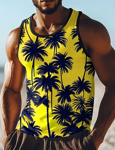 Miesten hihaton toppi, aluspaita, hihaton paita, U-aukkoinen, kesäinen, eloisa keltainen, musta, palmuja kuviollinen, trooppinen, rantaloman muoti, katu, rento urheilu-t-paita miehille S-XXXL