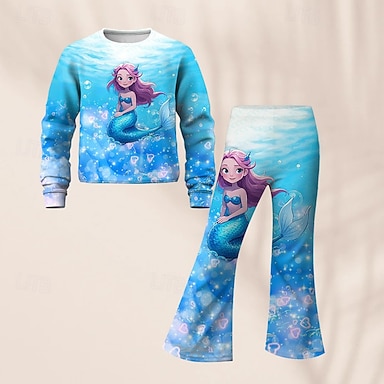 Tyttöjen 3D Kuvitettu Merenneito Urheiluasu Verryttelypuvut Huppari & Flare Pants -setti Pitkähihainen Kevät Syksy Päivittäin Vapaa-aika Lapset 4-12 vuotta Tiukka pyöreä kaula-aukko ulko- Loma Urheilu