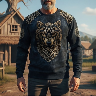 Miesten College Sininen Musta Ruskea Tiukka pyöreä kaula-aukko Susi Kelttiläinen solmu Painettu Kausaliteetti Päivittäin Katuvaatteet Vintage Viikinki Syksy Talvi Vaatetus Hupparit paidat