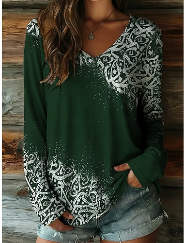 Naisten T-paita Painettu Kuvitettu Vintage Vapaa-aika Boheemi Pitkähihainen V kaula-aukko Tavalliset topit Päivittäin Laivaston sininen Oranssi Apila Kevät Syksy