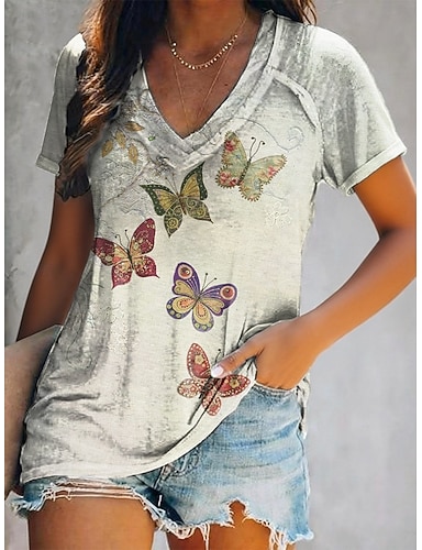 Naisten T-paita Painettu Kuvitettu Perhonen Böömi Vintage Tyylikäs Lyhythihainen V kaula-aukko Tavalliset topit Päivittäin Beesi Kesä Kevät