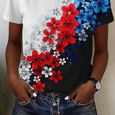 Amerikan itsenäisyyspäivä Naisten T-paita Painettu Kukka Kuvitettu Lippu Tyylikäs Klassinen Vapaa-aika Lyhythihainen Tiukka pyöreä kaula-aukko Pyöreä kaula-aukko Tavalliset topit Päivittäin Sininen