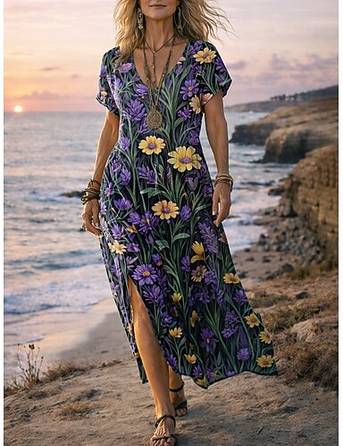 Naisten Maksimekko Boho-mekko Rento mekko A linjainen mekko Painatus mekko Vintage ulko- Hiekkaranta Loma Normaali Kukka Kuvitettu Lyhythihainen V kaula-aukko Purppura Kesä Kevät