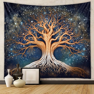 mystinen elämän puu taivaallinen esi-isien puu hehkuva kultaiset juuret galaksi tähtikirkas yö sininen kimalteleva tähtipöly seinävaate makuuhuone olohuone asuntola sisustus meditaatio tausta