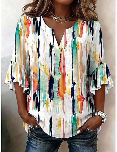 Naisten Pusero Röyhelö Painettu Kuvitettu Geometrinen Loma Päivittäin Retro / vintage 3/4 hiha V kaula-aukko Tavalliset topit Kausaliteetti Päivittäin Pyhäpäivä Sininen Purppura Oranssi Apila Kes