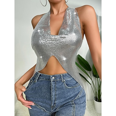 metallinen Selästä avoin Kimaltava Hameet Suojusliivi Crop Tank Top Disko Syvä V Naamiaispuku Naisten Juhla Klubi Pride-paraati Aikuisten Hame Tankkitoppi
