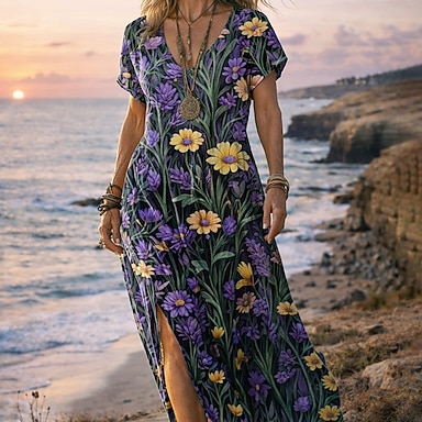 Naisten Maksimekko Boho-mekko Rento mekko A linjainen mekko Painatus mekko Vintage ulko- Loma Viikonloppu Normaali Kukka Kuvitettu Lyhythihainen V kaula-aukko Sininen Purppura Fuksia Oranssi Kes