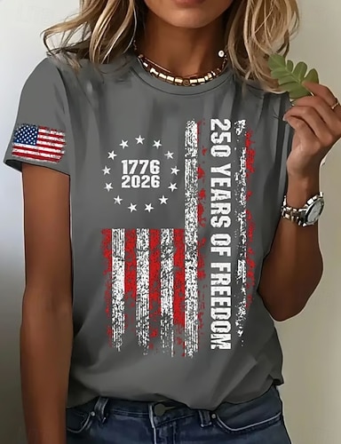 Amerikan itsenäisyyspäivä Naisten T-paita Painettu Kuvitettu Amerikan lippu Vintage Tyylikäs Klassinen Lyhythihainen Tiukka pyöreä kaula-aukko Tavalliset topit Päivittäin Sininen Valkoinen Rubiini