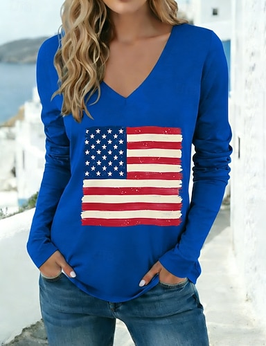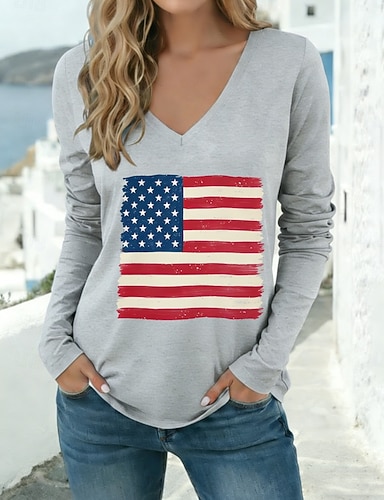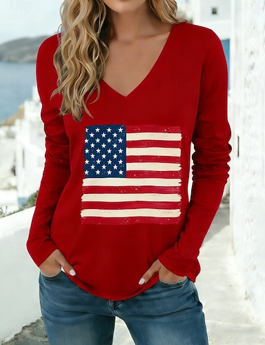 Amerikan itsenäisyyspäivä Naisten T-paita Painettu Kuvitettu Amerikan lippu Tyylikäs Klassinen Vapaa-aika Pitkähihainen V kaula-aukko Tavalliset topit Päivittäin Valkoinen Rubiini Khaki Kevät Syksy