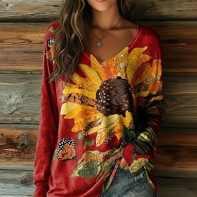 Naisten T-paita Painettu Kukka Kuvitettu Vintage Klassinen Vapaa-aika Pitkähihainen V kaula-aukko Tavalliset topit Päivittäin Sininen Purppura Apila Kevät Syksy