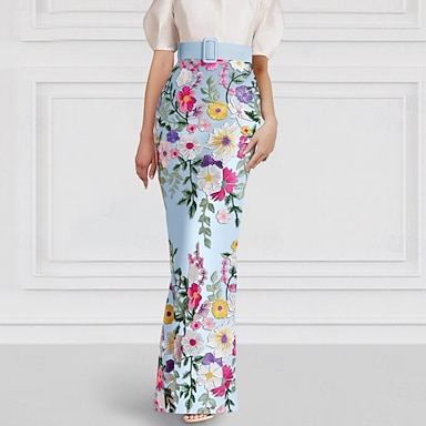 A-linjainen polvipituinen iltapuku juhlapuku palloilme jossa on ylikerros virallinen puku elegantti juhlapuku kukkakuosisella olkaimeton pyöreä kaula-aukko abipuku iltapukujuhla selkä avoinna