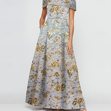 A-linja Kokopitkä Häävieraspuku Muodollinen mekko Iltapuku Morsiammen äidin asu Lyhythihainen Kauluskäänne Tyylikäs Vintage Häät Muodollinen Jakardi kanssa Rusetti(rusetit) Tasku