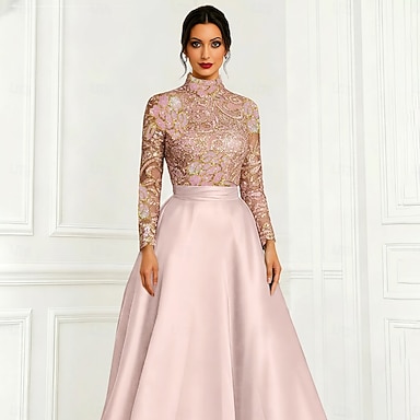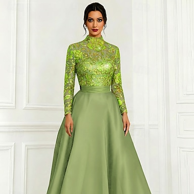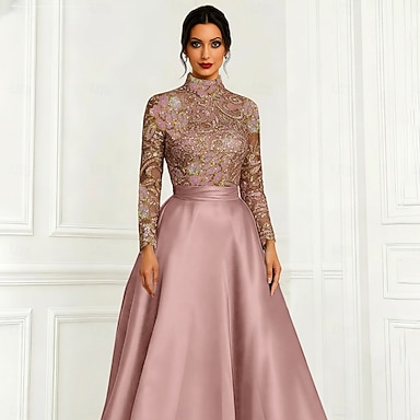 A-linja Kokopitkä Helmillä koristeltu Muodollinen mekko Morsiamen äidin mekko Iltapuku Muodollinen mekko Tyylikäs Kimaltava Silkkinen Pitkähihainen Illuusio-kaula Häät Muodollinen Satiini Pitsi