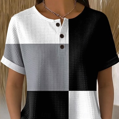 Naisten waffle-teksturoidut neulepuserot T-paita ombre graafinen geometria tyylikäs klassinen lyhythihainen crew-kaula-aukko Henley säännölliset puserot päivittäiseen urheiluun musta ja valkoinen