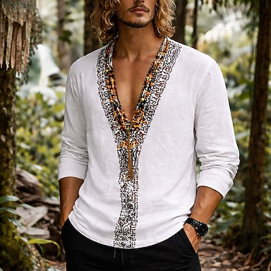 Miesten Paita Pellava paita Popover paita Kesä paita Ranta-asut retro paidat Etninen Loma Katu Apila Pitkähihainen V kaula-aukko Kesä Kevät Vaatetus