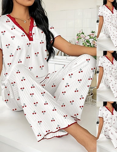 Naisten Yöpukusarja Vapaa-aika Mukavuus Sydän Joustava vyötärö Housut Päivittäin Koti Lyhythihainen V kaula-aukko Valkoinen Viini Rubiini Fuksia Kesä Kevät Loose Fit