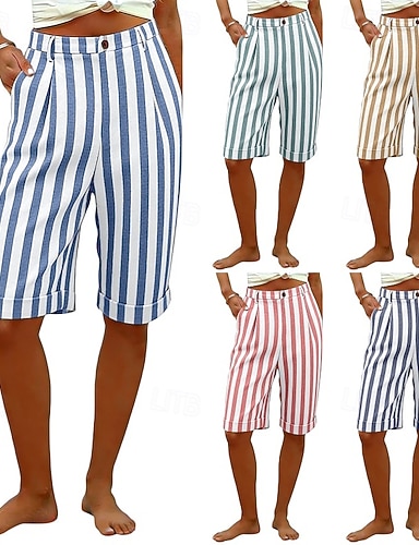 Naisten Puuvillaiset pellavashortsit Caprihousut Shortsit Kesähousut Loma Muoti Katutyyli Polven pituus Korka vyötärö Raita Tasku Hengitettävyys Mukava Joustamaton Päivittäin Loma Katu Sininen