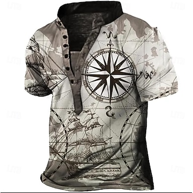 Miesten Vintage Kompassi Henley-paita T-paidat Lyhythihainen Vintage Muoti Suunnittelija ulko- Kausaliteetti Päivittäin Kesä 봄 & Syksy Tumman ruskea Harmaa Henley Henley T-paita