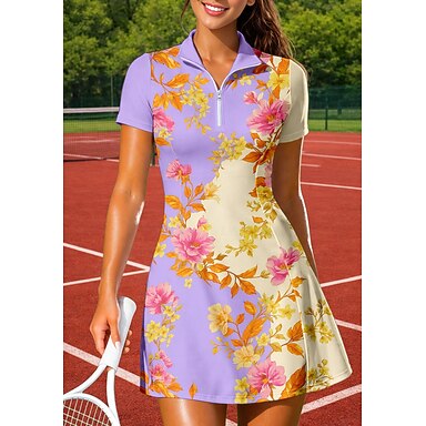Naisten Kukat Urheilumekko Tennispoolomekko Lyhythihainen Neljänneksen postinumero UPF50+ Elastinen Hikeä siirtävä Hengittävä Lentopallo Tennis Golf Kaulus Sänkyjen avaus Hameet Villapusero Purppura