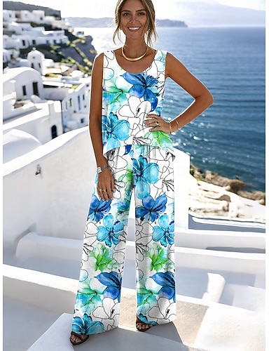 Naisten Housusarjat Hihaton U kaula-aukko Kukka Kuvitettu Loma Päivittäin Kausaliteetti Päivittäin Loma Sininen Rubiini Purppura Kesä Loose Fit