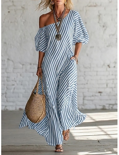Naisten Maksimekko Rento mekko A linjainen mekko Tyylikäs Hiekkaranta Loose Fit Kuvitettu Raita Lyhythihainen Yksiolkaiminen Sininen Musta Punastuvan vaaleanpunainen Rubiini Kesä Kevät