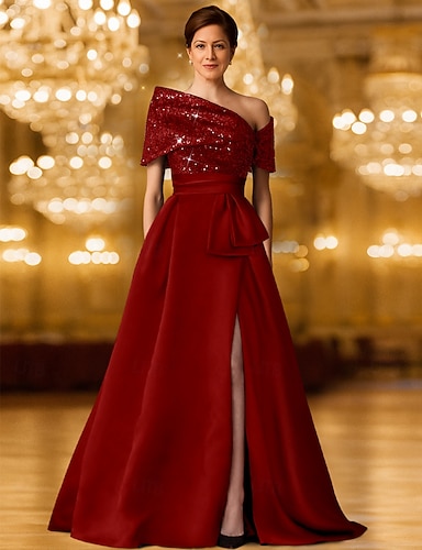 A-linja Kokopitkä Iltapuku Ball Gown Muodollinen mekko Tyylikäs Kimalteleva Silkkinen Pitkähihainen Yksiolkaiminen Häät Muodollinen Tasku Joustava satiini kanssa Kimalle