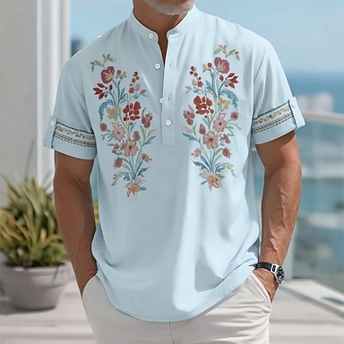 Miesten Kukkapainatus Etninen Kukat Paita Napita paita Henley-paita Lyhythihainen Vintage retro Pyhäpäivä Rento / arki Kesä Kevät Pystykaulus Henley kaulus 3D-tulostus Pellava kuin paita Sininen