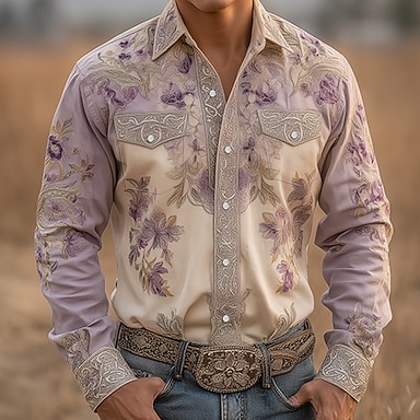 Miesten Kukkapainatus Kukat Paita Länsimainen paita Cowboy paita Pitkähihainen Vintage retro ulko- Kausaliteetti Työasut Kevät Syksy Sänkyjen avaus Kaksi etutaskua Pellava kuin paita Napitettavat