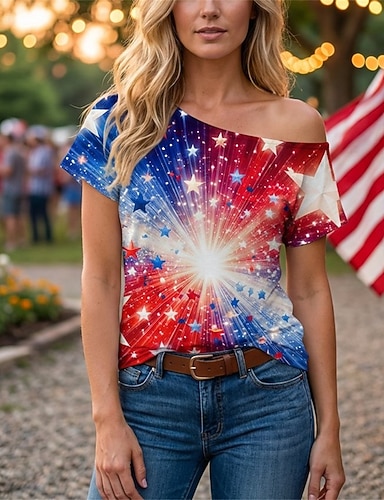 Amerikan itsenäisyyspäivä Naisten T-paita Painettu Amerikan lippu Tyylikäs Klassinen Vapaa-aika Lyhythihainen Pyöreä kaula-aukko Tavalliset topit Päivittäin Bile Viikonloppu Sininen Musta Valkoinen