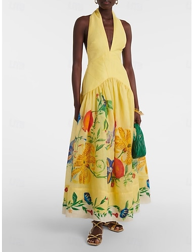 Naisten Maksimekko A linjainen mekko Loma Vapaa-aika ulko- Bile Normaali Kukka Kuvitettu Hihaton V kaula-aukko Keltainen Kesä Kevät