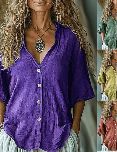 Naisten Pusero Keinopuuvillainen pellava Rypytetty Napit Yhtenäinen väri Tyylikäs Vapaa-aika 3/4 hiha V kaula-aukko Tavalliset topit Päivittäin Keltainen Rubiini Purppura Apila Kesä
