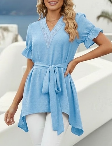 Naisten Paita Pusero Rypytetty Tilkkutäkki Epäsymmetrinen helma Tavallinen Aktiivinen Tyylikäs Lyhythihainen V kaula-aukko Pitkät topit Päivittäin Pyhäpäivä Bile Musta Rubiini Taivaan sininen Apila