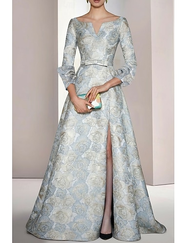 A-linja Kokopitkä Iltapuku Ball Gown Muodollinen mekko Tyylikäs Vintage Kukka-aihe Pitkähihainen V kaula-aukko Häät Muodollinen Tasku Jakardi kanssa Kirjonta