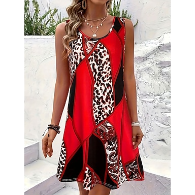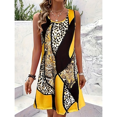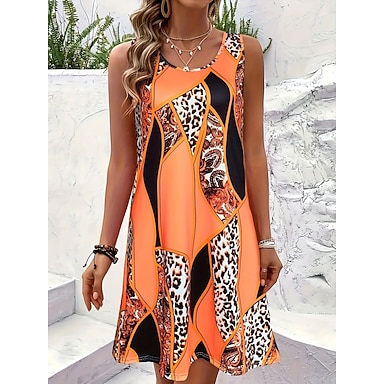 Naisten Polvipituinen mekko Kesämekko A linjainen mekko Loma Vapaa-aika Boheemi Hiekkaranta Juhla Häät Normaali Kuvitettu Leopardi Geometrinen Hihaton U kaula-aukko Keltainen Rubiini Oranssi Beesi