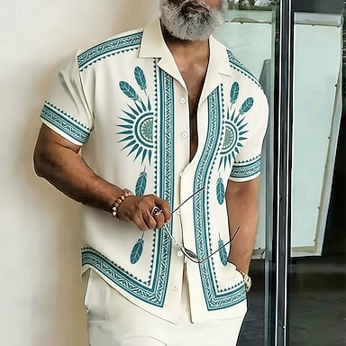 Miesten Geometrinen printti Etninen Aurinkototeemi Paita Button Up paita Leirin paita Lyhythihainen Vintage retro Katuvaatteet Loma Kesä Kevät Kuubalainen kaulus 3D-tulostus Sininen Punastuvan