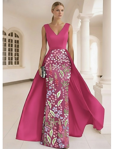 Mermaid-trumpetti nilkkapituinen juhlapuku cocktail-puku häävieraspuku morsiamen äidin puku 3/4-pituiset hihat V-kaula-aukko elegantti virallinen satiini jossa on tasainen väri