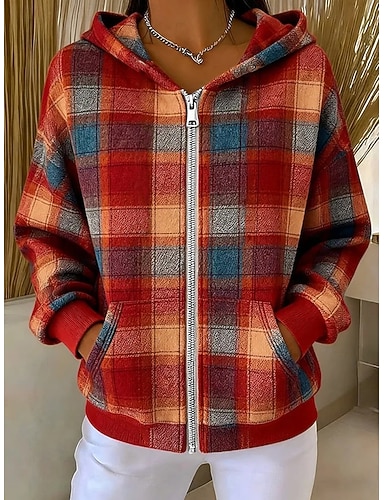 Naisten Vetoketjulliset hupparit Tilkkutäkki Vetoketju Tasku Kuvitettu Skottiruutukuvio Muoti Vapaa-aika Pitkähihainen Hupullinen Tavalliset topit Katu Arkikäyttö Sininen Keltainen Purppura Ruskea