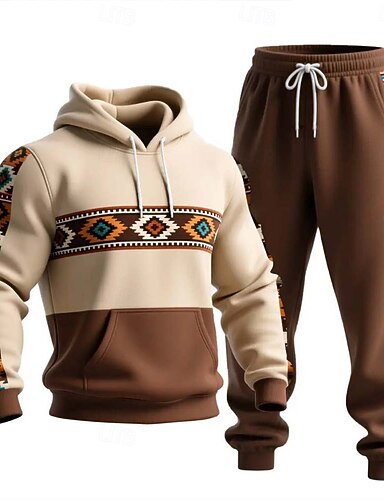 Miesten Tribaali 2kpl 3D-hupparisarjat Huppari Pitkähihainen Pitkät housut Hupullinen Etninen tyyli Rento arki Urheilu- ja treenivaatteet 3D-tulostus Kevät Syksy Talvi Ruskea